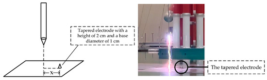 To confirm whether the discharge path would be affected by the electric field distribution on the surface of the plane electrode, in this paper a tapered electrode was placed at X cm (Separate tests were carried out for cases X = 20 and X = 30) from the intersection of the vertical line from the tapered end of the rod electrode and the plane electrode to verify whether the breakdown point would fall on this tip electrode. The test results show that the breakdown point does not fall on the tip electrode, as shown in Figure 8, i.e., the path of the discharge is not affected by the electric field distribution of the plane electrode.