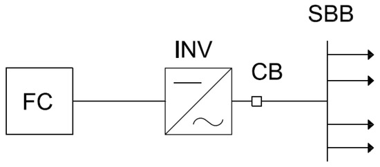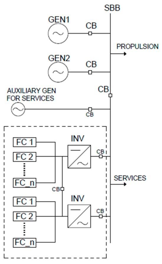 Starting from the scheme in Figure 1 (the traditional one), the goal is to eliminate the generators used for base hotel loads and replace this with a 1 MW modular FC system. The generators used for propulsion remain unchanged. To increase the reliability of the system, however, an auxiliary generator will be retained as a back-up that will not be used under ordinary conditions and therefore is not dealt with here. Starting from the scheme in Figure 1, with two power generators and two generators for hotel loads, the system shown in Figure 2 can be obtained. In this model, 1 MW of the hotel loads will be replaced by the FCs, and two generators are added for back-up power (hot or cold) [26].