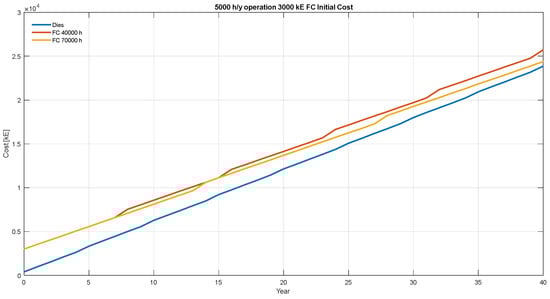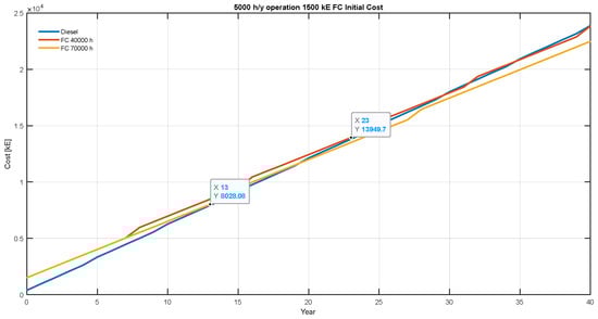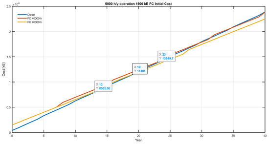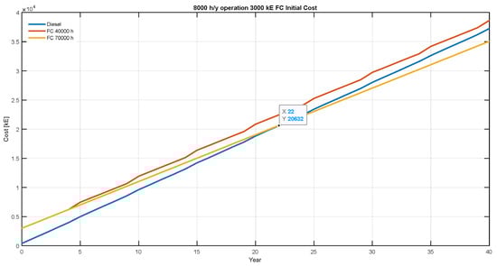 The result obtained and shown in Figure 3 suggests that the fuel cell system is more convenient for operating times above 2001.4 h, while for generation with operation below 2001.4 h, the conventional generator is more convenient. This is under the assumption that there is no intermediate refueling in the cruise ship route.