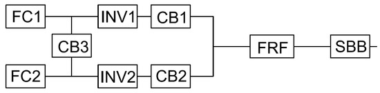 These values are purely statistical data, and MTBF should therefore not be mistaken for the lifetime of a system. A given system may not fail during its operating life, while others perhaps may fail several times. The proposed circuit model definitely involves the presence of one or more UPS given the absolute continuity requirement. One might think that downstream of the SOFC system, there is a “no-break” load. The case study with UPS is not considered since a UPS is not present in the generation. For reliability, there is the concept of fault tolerance, and it is possible to switch to a back-up component or group by introducing the concept of redundancy. The prerequisite for practical redundant operation is a system that can be repaired. One could think of exploiting the SOFC system by dividing the 1 MW power into two or more systems and also dividing the related inverter by creating a link, which, as illustrated later, in the RBD model is a parallel connection. Systems, both fuel cells and inverters, can be connected in parallel. Increasing the number of components in parallel will increase the probability of failure but it will also tend to increase the MTBF value. The reason for parallel connection is the introduction of a redundant component. Redundancy increases reliability and the value of the MTBF. In an n + 1 system, the redundant unit (+1) must remain available for all remaining n units. The following figures report the presence of the power split in two. CB3 is a disconnect switch that is normally open and will be closed only if one of the two inverters goes out of service.
