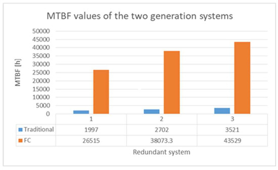 In the study with the generators the simple one-generator system is initially used to achieve a more real case than that involving three generators in parallel, to ensure increased redundancy, obtaining a final MTBF of 0.4 years. In the FC case study, an initial MTBF value of 3 years is chosen and, with appropriate redundancies, can be increased to as high as 5 years. Considering these two values at first reading, it would seem that the SOFC system is much more reliable than the traditional generation system. In reality, the traditional generation unit has a low MTBF value because there are many more components that make up the generation part than those that make up the innovative generation system in the FC system. The MTBF value of the FC system is only that of the stack. The MTBF values of the BoP are not available because it also consists of new technologies. From the point of view of maintenance, the traditional generation group is characterized by a greater commitment, both economically and also from the point of view of maintenance timing. Generation with the SOFC system is characterized by lower maintenance expense. The MTTR of FCs can be approximated to zero because there is rapid replacement (box type). Redundant generation systems allow failures in individual modules without causing the entire system to lose functionality and improving the general reliability as shown in Table 8. The probability of a double fault that could cause load power failure increases as the MTTR of the module increases.