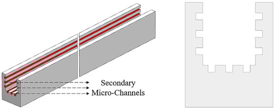 Currently, a structure with secondary grooves has been applied in some plate heat exchangers, as shown in Figure 2. This design offers advantages such as simplicity in structure and ease of manufacturing. Therefore, a new enhanced heat dissipation structure, which incorporates secondary micro-grooves on the surface of the air-cooled PEMFC bipolar plate flow channels, is proposed. This design ensures good compatibility with the original flow channel structure of the bipolar plate. The presence of secondary grooves increases the heat transfer area, enhances heat exchange efficiency, and can also help reduce the overall weight of the air-cooled PEMFC to some extent.
