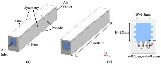 This study primarily analyzes the heat transfer characteristics of the conventional cathode flow channel and the novel secondary micro-channel cathode flow channel in air-cooled fuel cell bipolar plates. Based on the heat dissipation characteristics of air-cooled fuel cells and simplified calculations, a single flow channel is used as the computational model due to symmetry and periodicity conditions, as shown in Figure 4. Figure 4a shows the conventional flow field (CF), while Figure 4b illustrates the secondary micro-channel flow field (SMF). Here, L represents the length of the flow channel, L = 60 mm; denote the width and depth of the conventional rectangular flow channel, W = 1.5 mm, H = 1.8 mm; the width and depth of the secondary micro-channels are w = h = 0.2 mm; s represents the spacing between the secondary micro-channels, set at s = 0.5 mm.