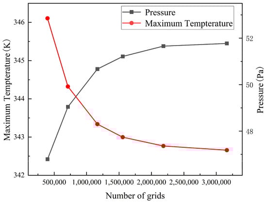 To ensure result accuracy while improving computational efficiency, a mesh independence analysis was conducted. This helps evaluate the impact of different mesh configurations on the solution results, allowing us to determine an appropriate mesh density for efficient numerical computation. A traditional rectangular straight flow channel was used as a reference, and mesh independence verification was carried out by selecting mesh sizes of 3,968,520, 7,113,970, 11,658,580, 15,563,920, 21,840,640, and 31,619,890 elements. The highest temperature on the MEA surface and the pressure drop between the inlet and outlet of the flow channel were used as evaluation criteria, with an inlet airflow velocity of 4 m/s. The results of the mesh independence verification are shown in Figure 5. As the number of mesh elements increased, the computed values of the highest temperature on the MEA surface and the pressure drop between the inlet and outlet gradually stabilized. When the mesh size increased from 21,840,640 to 31,619,890 elements, the variation in the highest temperature on the MEA surface was only 0.05%, while the variation in the pressure drop was 0.6%. These changes were minimal, indicating that further mesh refinement would have a negligible effect on the numerical simulation results. Therefore, the final mesh size was determined to be 21,840,640 elements. The meshing results are shown in Figure 6.