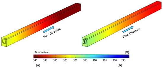 As shown in Figure 7, the surface temperature distribution of the bipolar plate and MEA for both flow channel models at an inlet velocity of 4 m/s is illustrated. It can be observed that the temperature is lower at the inlet for both channels and gradually increases from the inlet to the outlet. This is because the primary mode of heat transfer between the fluid and the wall is thermal conduction, which is mainly influenced by the temperature difference between the fluid and the solid. The inlet cooling air has a lower temperature, and as it flows through the channel, it absorbs significant heat, resulting in a temperature drop. However, as the air continues to flow towards the rear end of the channel, its temperature rises, reducing the temperature difference and consequently decreasing the heat transfer rate. Thus, the temperature at the rear end of the channel is higher than at the front end. Comparing the surface temperature distribution of the two flow channels, it is evident that from the inlet to the outlet, the surface temperature of the bipolar plate and MEA in the secondary micro-channels flow field is lower than that of the traditional straight flow channel, with the maximum temperature reduced by approximately 4 °C. To more intuitively illustrate the effect of the secondary micro-channels, the temperature distribution contour at the bottom cross-section of both flow channels was selected when the micro-channels depth H = 1.8 mm, as shown in Figure 8. As can be clearly seen in Figure 8b, the three lower-temperature strip-shaped regions correspond to the locations of the secondary micro-channels. The presence of these micro-channels increases the forced convective heat exchange area for air, converting part of the solid bipolar plate region into a fluid region. As a result, at the same position, the temperature of the fluid is lower than that of the solid region, creating a temperature gradient that enhances heat exchange. Consequently, compared with the traditional straight flow channel, the temperature of the bipolar plate and MEA in the secondary micro-channels flow field is significantly reduced.