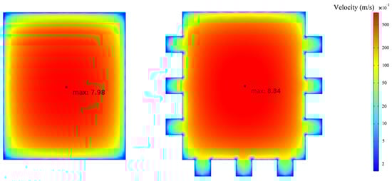 To more clearly observe the effect of the secondary micro-channels, the velocity distribution at the mid-section of the flow channel is shown in Figure 9, where the left side represents the conventional straight channel, and the right side represents the channel with secondary micro-channels. As shown, the velocity near the solid walls of the conventional straight channel is almost zero, resulting in a thicker boundary layer. This increases thermal resistance in the convective heat transfer process and reduces overall heat transfer efficiency. In contrast, the channel with secondary micro-channels features multiple micro-channels on the bottom and sidewalls, which not only increase the airflow rate and enhance the velocity at the channel center but also alter the boundary layer near the original wall. A portion of the new boundary layer develops inside the secondary micro-channels, while another portion in contact with the original wall becomes thinner, ultimately enhancing heat transfer efficiency.