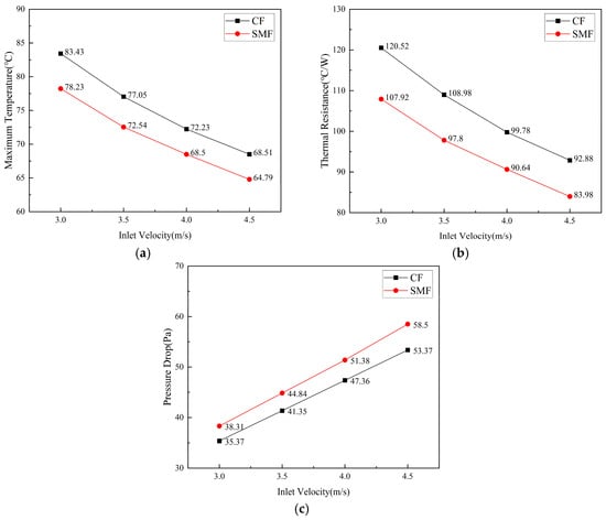 As shown in Figure 10, the line charts depict the variations in the maximum temperature at the center plane of the membrane electrode assembly (MEA), the thermal resistance, and the pressure drop of the flow channels under different inlet velocities for both flow channel types.