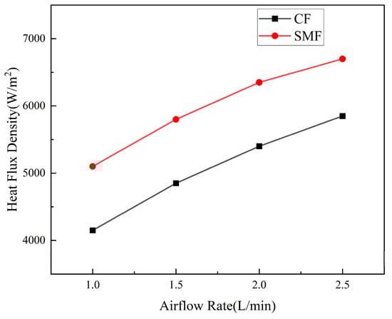 Once the system reaches a stable temperature, air is introduced. Data are recorded for 10 min at each airflow rate before switching to the next airflow setting. The variation in heat flux density for the two flow channels under different airflow rates is illustrated in Figure 12.