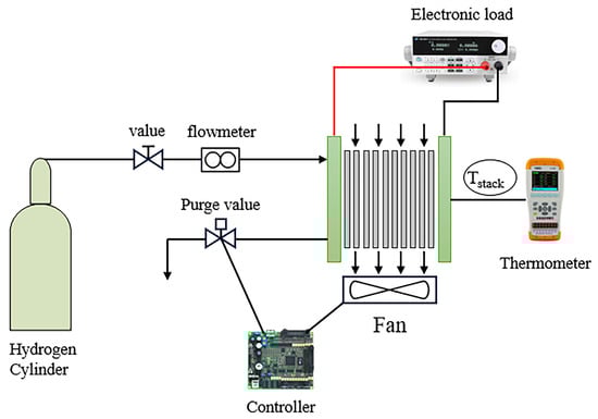 Based on the aforementioned study on the enhanced heat transfer of the secondary micro-channels flow field, an air-cooled fuel cell stack was independently designed and assembled to verify the beneficial effects of the secondary micro-channels cathode flow field on air-cooled fuel cells. A schematic diagram of the experimental setup is shown in Figure 13.