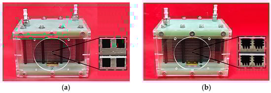 The air-cooled PEMFC stack used in the experiment consists of 15 membrane electrode assemblies (MEAs) with an active area of 37 cm2, which were provided by Suzhou Qing dong Power Technology Co., Ltd. The stack is assembled with 16 bipolar plates, and the dimensions of the cathode flow channels are the same as those in the model described in the previous section. The secondary groove dimensions are based on the optimized parameters. The overall size of each bipolar plate is 120 mm × 60 mm × 3 mm, with 32 cathode flow channels, all manufactured using electrical discharge machining (EDM). The physical appearance of the two stacks is shown in Figure 14a, where the only difference is the cathode flow channel structure of the bipolar plates, while all other components remain the same. The testing experiments were conducted using the fuel cell test platform shown in Figure 14b. The ambient air temperature was approximately 25 °C, with a relative humidity of around 40%. The hydrogen inlet pressure was set to 50 kPa, and the airflow rate was automatically adjusted by a programmed controller via a fan. A solenoid valve installed at the hydrogen outlet was programmed to open every 20 s for 0.5 s to periodically purge the anode exhaust and water. Prior to the experiment, the fuel cell stack was activated. The polarization performance of the stack was then tested under a constant current mode. An electronic load was used to gradually apply current, with each set current value maintained for 5 min before recording the experimental data. The operation was halted once the stack temperature reached 60 °C.