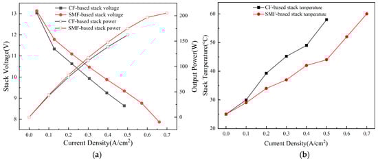 Fuel cell stacks with different cathode flow channels. (a) CF-based stack. (b) SMF-based stack.