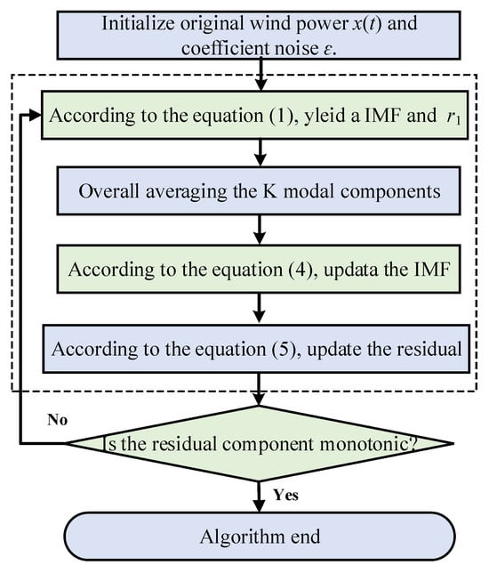 Define to be the sequence of historical wind power data, and Gaussian white noise with a normal distribution is added to the original signal to obtain the preprocessed sequence. The is the value after experiencing k iterations, as shown in Equation (1).
