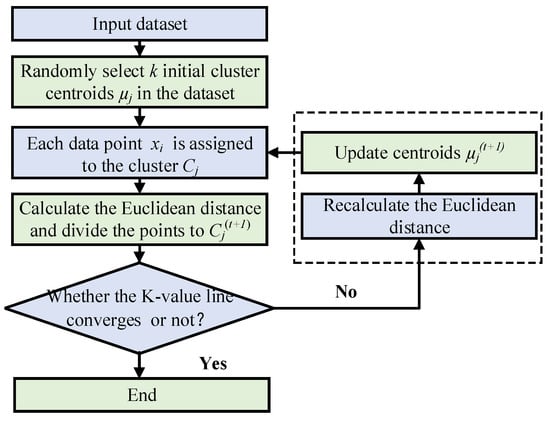 In the selection of a K value, if there is no prior knowledge, a suitable k-value can be selected through cross-validation and the K-means algorithm only requires parameter tuning for K. At the same time, the algorithm has a fast convergence speed. The quality of the cluster results depends on the density of clusters and the differences between clusters. The flowchart of the K-means algorithm is shown in Figure 2.