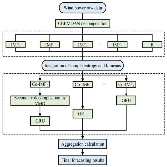 The short-term forecasting model of wind power based on CEEMDAN–K-means–VMD–GRU is completed, and the prediction process is shown in Figure 3.