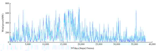 The wind power dataset was obtained from ENTSO-E, sourced from the German power company (Essen, Germany) 50 Hertz. The data were collected from 23 August 2019 to 22 September 2020 with a collection frequency of 15 min/time. A total of 397 days with 38,112 samples were selected for training. The dataset exhibits outliers or missing values, demonstrating high completeness, as it is directly sourced from the company’s operating wind power system, and the raw wind power data are shown in Figure 4. It can be seen that the points are so irregular that conventional forecasting methods are unable to predict them at all.