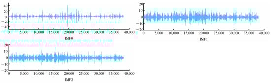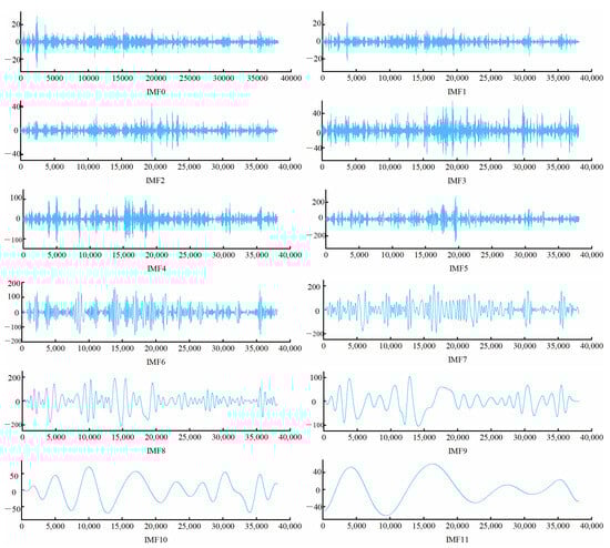CEEMDAN, which has its roots in EMD, uses ensemble averaging along with the adaptive addition of Gaussian white noise to suppress mode mixing. The decomposition process is characterized by its inherent completeness and nearly error-free reconstruction. EMD is an adaptive signal decomposition method used to decompose complex signals into a series of IMFs. However, EMD has a lot of problems, such as sifting criterion, endpoint effect, mode mixing, and so on. Generally, mode mixing will result in IMF components having unclear physical interpretations and affect the next analysis [30]. To address the problem, CEEMDAN introduces the concept of adaptive noise. After each EMD decomposition, white noise is added to the signal, and then, EMD decomposition is performed again. The inherent randomness of white noise introduces slight variations in the results of each decomposition [31]. To mitigate modal aliasing and obtain more accurate IMFs, the investigators propose averaging the results of multiple decompositions. After the above processing steps, the CEEMDAN improves these problems, such as modal confounding and reconstruction errors. Compared to WT, EMD, EEMD, and CEEMD, the CEEMDAN has higher completeness and stronger data feature extraction ability. When using the CEEMDAN algorithm to decompose noisy signals, it is important to note that, if the IMF components with more noise are directly discarded, it is easy to cause the loss of effective information. Therefore, other denoising methods need to be used to denoise the high-frequency IMF components with more noise. Finally, the denoised IMF components and the original IMF components are reconstructed to obtain the denoised signal. After the above processing steps, the CEEMDAN decomposition is shown in Figure 1.