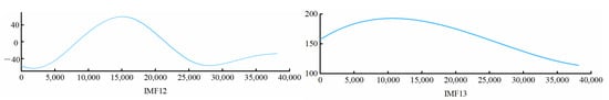 In the preprocessing, the CEEMDAN method is used to accurately extract the features of the data and get the subsequence with high feature regularity to improve the accuracy of data prediction. The subsequences decomposed by CEEMDAN are shown in Figure 5 and Figure 6. From the decomposition results in Figure 5, the IMF13 component of the original wind power sequence decomposed by CEEMDAN has a small amplitude and frequency compared with the raw wind power data, which can explicitly map the trend inherent in the data. Following the decomposition, the signal curves of the resulting sequence components exhibit an increasing trend toward stability and demonstrate a defined periodicity.