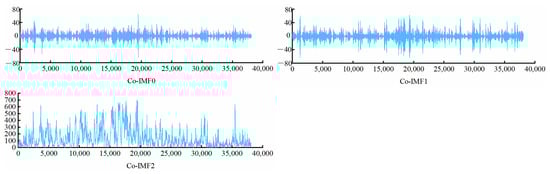 To further the intrinsic features of the sequence, the sample entropy of sub-sequences can indicate the extent of the correlation between the component and the original component, and the results of the calculations are shown in Table 1. It can be seen that the ordered components, which have the same K value, can be clustered into three groups, namely ‘Co-IMF0’, ‘Co-IMF1’, and ‘Co-IMF2’. Moreover, the sample entropy results after integration are shown in Table 2, and the results of the integration components are shown in Figure 7.