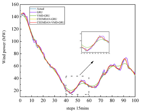 Wind power forecast curves of 4 models, including GRU, VMD-GRU, CEEMDAN-GRU, and CEEMDAN-VMD-GRU.