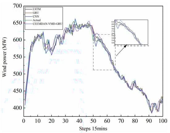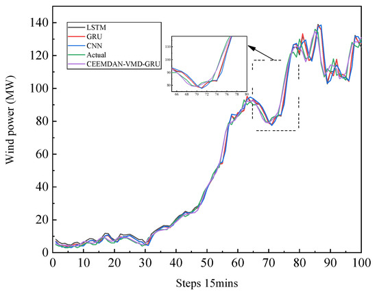 In order to verify the practical applicability of the model, we selected power generation during peak and low hours of electricity consumption as sample points. The peak period was from 19 September 2019 to 30 January 2020, and the low-hours period was from 27 June to 27 June 2020. The predicted results for the peak electricity load curve are shown in Figure 10 and Figure 11, and the real wind power data are cited from 26 August 2020 and 20 September 2019. These figures demonstrate that, in comparison to other models, this model exhibits the greatest overall similarity between the CEEEMDAN-VMD-GRU curve and the original data. These also show that the proposed model still provides a good fit at the peaks and troughs of the wave. However, the predictive accuracy of other models has declined because predicting extreme values requires not only high model accuracy but also high model stability.