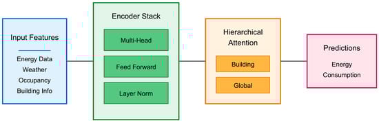 The transformer architecture implemented in this study builds upon the standard encoder-decoder structure with several modifications optimized for multi-building energy prediction. Figure 1 illustrates the overall architecture of the proposed transformer model for multi-building energy prediction. The model consists of an input layer processing multiple data streams, an encoder stack with modified attention mechanisms, a hierarchical attention layer, and an output prediction layer.