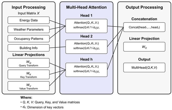 As illustrated in Figure 2, the multi-head attention mechanism consists of three main components: (a) Input processing with linear projections for Q, K, and V matrices, (b) Parallel attention heads computing softmax with different learned projections, and (c) Output processing through concatenation and final linear projection. Each head can specialize in different temporal patterns and building characteristics, enabling comprehensive feature extraction. The dimension represents the size of key vectors, and h denotes the number of attention heads.