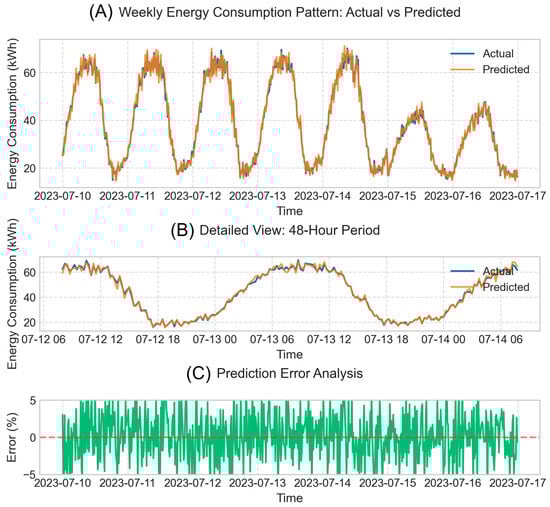 Energy consumption prediction performance analysis. (A) Weekly overview of actual vs. predicted patterns. (B) Detailed 48 h analysis. (C) Error analysis.
