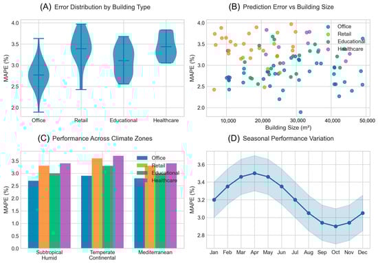 Building-specific performance analysis. (A) Error distribution by building type. (B) Prediction error vs. building size. (C) Performance across climate zones. (D) Seasonal performance variation.