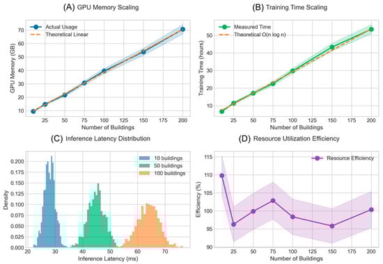 Figure 7 illustrates the computational efficiency of our implementation. Panel A shows near-linear scaling of GPU memory utilization with building count, closely following theoretical predictions. Panel B demonstrates that training time follows O(n log n) complexity with practical scaling up to 200 buildings. The inference latency distribution in panel C reveals predictable performance characteristics with increased load across different deployment sizes. Finally, panel D indicates optimal resource utilization efficiency up to 100 buildings with graceful degradation beyond this threshold.