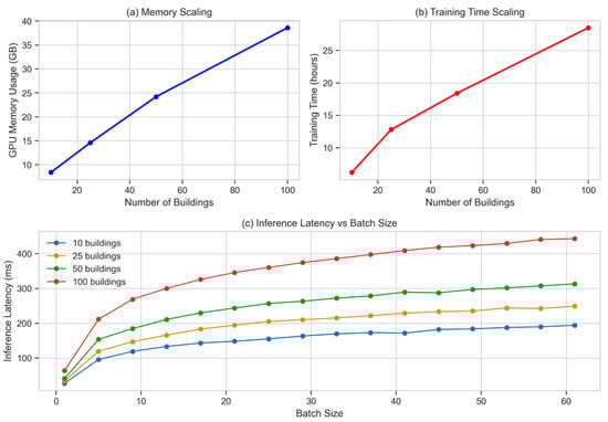 Computational performance analysis: (a) GPU memory usage scaling with building count; (b) Training time requirements across different deployment sizes; (c) Inference latency analysis for various batch sizes and building counts.