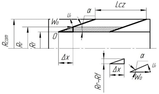 Schematic diagram of flowing stream calculation. Rcom—radius of the combustor, Rr—radius of the front edges of the flame front, Rf—radius of the rear edges of the flame front, Δx—axial distance over which the velocity change occurs, α—inclination angle of the velocity vector, lcz—length of combustion zone.