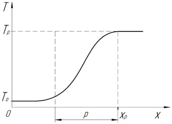 At 0 ≤ x ≤ xp, combustion occurs, and at x ≥ xp, the temperature is equal to Tp. Also, for x < 0, Expression (28) is valid, leading to