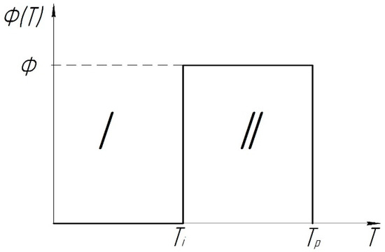 Several approximate methods have been proposed to circumvent the complexities of integrating Equation (11), such as the Jouguet–Daniell method [22]. This method assumes that the function Φ changes with temperature according to a step law, as illustrated in Figure 3. Specifically, at temperatures below Ti and above Tp, Φ = 0, and within the range Ti ≤ T ≤ Tp, Φ remains constant.