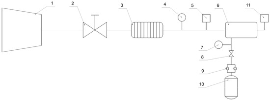 Figure 5. Schematic of the experimental test rig facility. 1—main blower, 2—throttle valve, 3—heat exchanger, 4—measuring device, 5—thermocouple group Chromel-Copel (type L), 6—test combustor, 7—pressure gauge, 8—stopcocks, 9—gas reducer, 10—LPG bottle for main combustor, 11—gas sampling and temperature measurement site. - Fuel Supply System: Consisting of propane/butane, natural gas, and CO₂ containers, gas reducers, isolation valves, mixers, and nozzles. Precise fuel regulation was ensured through gas reducers and stopcocks.