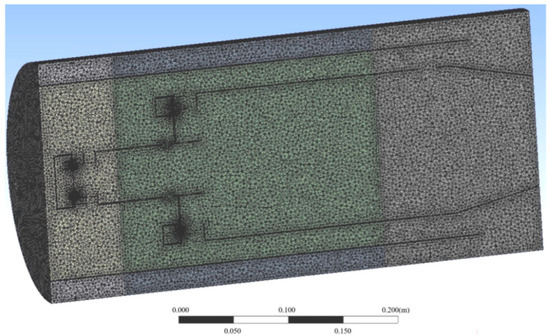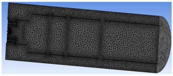 The CFD simulations for the second combustor design were conducted using a mesh model composed of ~5 million tetrahedral elements. Wall layers and mesh condensation were applied in areas with complex geometries to ensure accurate resolution of flow dynamics. The mesh quality was maintained with a maximum skewness of 0.83, as shown in Figure 16.