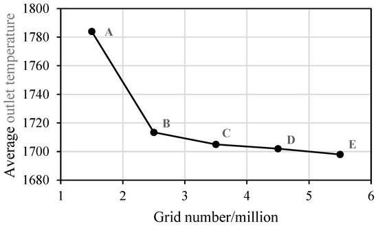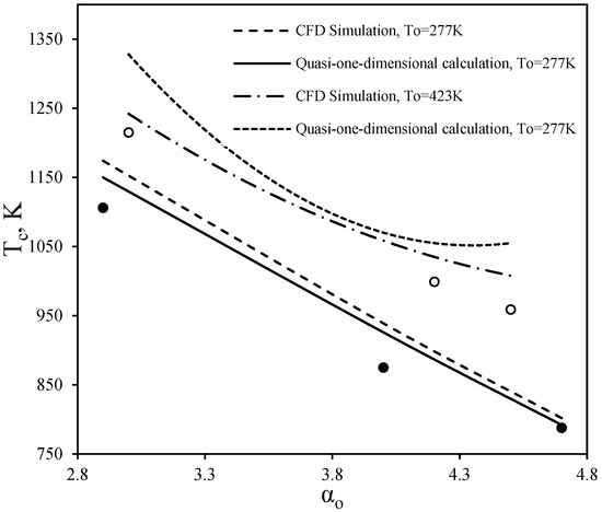 The results of the CFD simulations were compared with experimental data for the two-zone combustor. Figure 17 shows the comparison of calculated and experimental temperatures at the outlet section for two different air inlet temperatures (277 K and 423 K). The experimental data points are represented by solid (●) and hollow (○) circles, respectively.