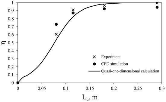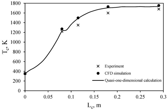 The temperature distribution along the combustor length, obtained from CFD simulations, closely matched both experimental and theoretical data (see Figure 10). The maximum deviation observed between the CFD and experimental temperatures was 8.12%, while the difference between the quasi-one-dimensional calculation and experimental data was 9.05%. These small discrepancies are within acceptable limits, further affirming the accuracy of the mathematical model.
