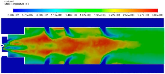 The incorporation of CFD modeling enhances the analysis by offering detailed visualizations, such as the temperature distribution along the combustion chamber (Figure 12). These insights reveal a high-temperature region near the wall, suggesting the necessity to extend the premixed zone for improved performance. However, this observation does not undermine the efficacy of the proposed model. Despite its relative simplicity, the model accurately predicts critical combustion outcomes, including the completion of combustion and the achievement of a uniform temperature distribution at the chamber’s exit, as demonstrated in Figure 12. This indicates that while CFD modeling provides a more granular view, the proposed model remains effective in capturing essential combustion characteristics.