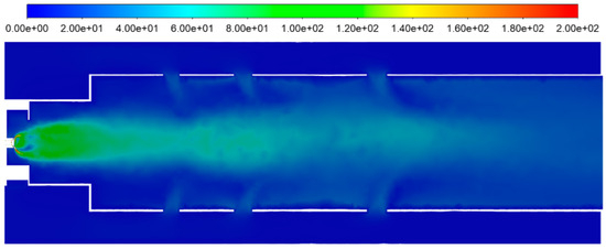 Velocity magnitude contours (Figure 13) further illustrate the flow dynamics, emphasizing the role of inlet flow parameters in shaping the internal flow structure. The velocity field indicates a steady acceleration downstream, with minimal backflow or turbulence-induced inefficiencies. This confirms the model’s robustness in predicting flow uniformity and combustion efficiency, as the observed velocity profiles correspond closely with experimental benchmarks.