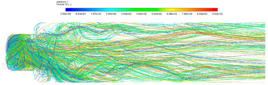 Particle pathlines (Figure 14) depict detailed flow trajectories and reveal the interaction between fuel–air mixing and combustion propagation. The pathlines show a highly streamlined flow with minimal recirculation zones, contributing to efficient mixing and reduced unburnt fuel zones. These visualizations underscore the model’s ability to capture key dynamics and validate its performance in designing combustors that achieve optimal combustion with minimal emissions.