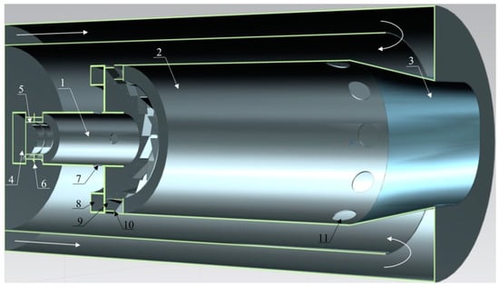 Geometric 3D model of the two-zone combustor. 1—pilot zone; 2—main zone; 3—outlet section (mixing zone); 4—pilot zone fuel manifold; 5—fuel supply holes; 6—double tangential vane swirler; 7—liner of radial holes; 8—main zone fuel manifold, 9—fuel supply holes; 10—double tangential vane swirler with counter-twist; 11—liner of radial holes of the mixing zone.