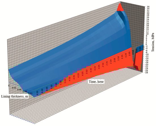 When the lining cools, the magnitude of thermal stresses changes across its thickness and over time. For the convenience of visual assessment of the obtained thermal stresses, three-dimensional graphs of the stress distribution across the thickness of the refractory were made (Figure 1 and Figure 2).