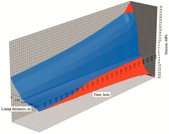 As can be seen from the graph, during the cooling process of the ladle, the zone of excess thermal tensile stresses is significantly larger than the zone of excess thermal compressive stresses. Tensile stresses exceeding 6 MPa act on the outer surface of the lining at a depth of up to 80 mm. The duration of action of these stresses was 250 min. The maximum value of thermal tensile stress occurred at the initial moment of cooling and exceeded the ultimate tensile strength by 4.4 times.