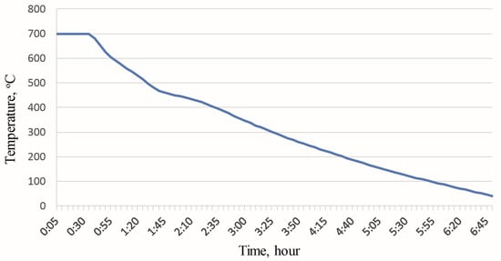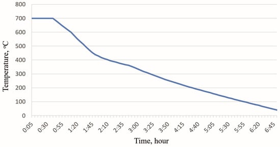 The cooling graph in Figure 5 is similar in nature to the graph shown in Figure 3. Despite the different cooling rates in individual periods of the developed schedule, the total cooling time of the lining of the casting ladle also amounted to 6 h 50 min.