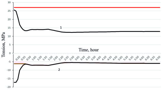 Curve 1 shows the values of the thermal compressive stresses during the cooling process and curve 2 shows the values of the thermal tensile stresses during the cooling process.