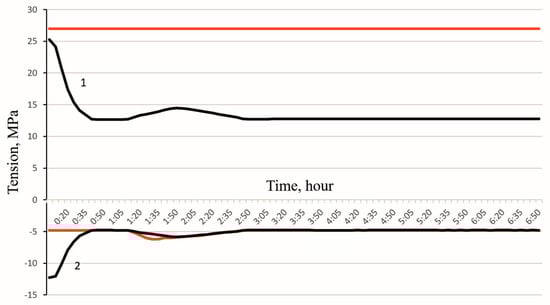 The average rate of the temperature decrease was about 2 °C/min. The maximum cooling rate was 200 °C/h in the time interval from 0:40 to 1:40. The total cooling time of the casting ladle lining was reduced from 19 h 30 min to 6 h 50 min. The values of the thermal stresses that correspond to the developed lining cooling schedule are shown in Figure 4.