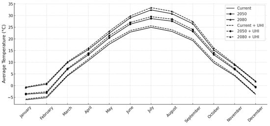 When UHI effects were added to current and future weather scenarios, additional warming was observed across all scenarios, averaged over the months. For instance, in January, the Current + UHI temperature registers −5.78 °C, which is 0.26 °C warmer than the current baseline of −6.04 °C. In the future scenarios, January temperatures under UHI effects rise to −3.43 °C in 2050 + UHI, an increase of 0.25 °C compared to the 2050 baseline, and to −0.58 °C in 2080 + UHI, which is 0.23 °C higher than the 2080 baseline. Warmer months show a slightly larger UHI-induced increase. For example, the Current + UHI temperature in July is 23.91 °C, which is 0.71 °C warmer than the current baseline of 23.20 °C. The corresponding UHI-adjusted temperatures for July in 2050 and 2080 are 28.46 °C, an increase of 0.85 °C compared to the 2050 baseline, and 31.79 °C, which is 0.99 °C higher than the 2080 baseline.