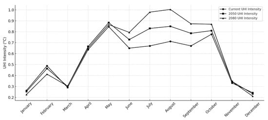 However, the interaction between climate change and UHI effects is complex and not a simple linear increase. Some projections indicate that rising atmospheric temperatures may weaken urban-rural contrasts at night, leading to reduced nocturnal UHI intensities in future scenarios. Conversely, higher background temperatures during the day—particularly in summer—limit urban cooling efficiency, sustaining UHI effects despite overall warming [87]. The results presented here affirm this trend, with August UHI intensities increasing from 0.71 °C in the current scenario to 1.00 °C by 2080, highlighting the amplification of daytime heat retention in urban areas. However, some studies suggest a potential weakening of winter UHI due to a diminishing urban–rural temperature gradient. Despite this, the simulations indicate only a minor reduction in December UHI intensity, from 0.24 °C (current) to 0.21 °C (2080). Although seasonal variations persist, the overall trajectory of UHI intensity remains upward—particularly in warm months—as climate change exacerbates urban heat stress.