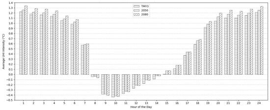 During the early morning hours, UHI intensities begin to decline steadily, transitioning into UCI conditions shortly after sunrise. In all scenarios, the UCI effect becomes evident around 8:00, with the temperature difference between the weather scenarios and their UHI-induced conditions becoming negative. The lowest intensities are recorded between 9:00 and 11:00, with peak values of −0.39 °C, −0.38 °C, and −0.41 °C in the current, 2050, and 2080 scenarios, respectively. As the day progresses, the intensity shifts back toward positive values as urban surfaces reheat. This transition occurs consistently at 15:00 across all scenarios, reflecting a balance between heat absorption and cooling throughout the day. The intensities continue to rise steadily through the evening, completing the daily UHI cycle. The presence of a morning UCI effect has been widely documented in various urban environments, where synoptic conditions and thermal storage differences between urban and rural areas influence cooling patterns. In Melbourne, Australia, early-morning UCI effects have been observed, attributed to lower heat retention in urban areas under specific atmospheric conditions [17]. Similarly, research in Hong Kong indicated that low-rise, low-density urban areas experienced a stronger UCI effect compared to high-density regions, largely due to lower thermal storage and reduced nighttime heat retention [88]. The findings here reflect a similar trend, suggesting that urban morphology and atmospheric factors influence early-morning cooling patterns, reinforcing the complexity of daily temperature dynamics in urban areas.