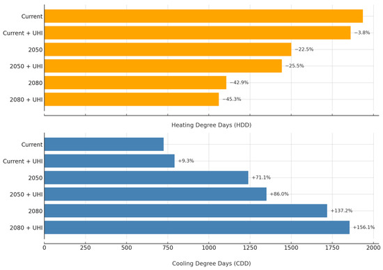 In the current scenario, the HDDs are 1934 °C days, while the CDDs are 7120 °C days, indicating that the baseline climate is heating-dominated (Figure 5). However, HDDs show a clear decreasing trend from the current scenario to future scenarios, beginning with a 3.8% reduction when UHI effects are added to this scenario. In the 2050 scenario, HDDs decrease further by 22.5% compared to the current scenario, while the inclusion of the UHI effect amplifies this reduction to 25.5%. By 2080, the decrease becomes even more pronounced, with a 42.9% reduction without the UHI and a 45.3% reduction with the UHI.